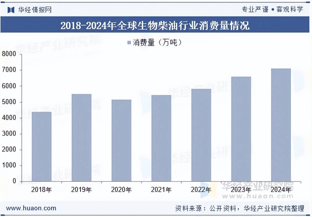 正在柴油消费量提高、生物柴油强制添加比例提高的布景下,生物柴油行业送来了二十年的快速成长。据统计,全球生物柴油消费量由2018年的4401万吨增加至2024年的7123万吨。