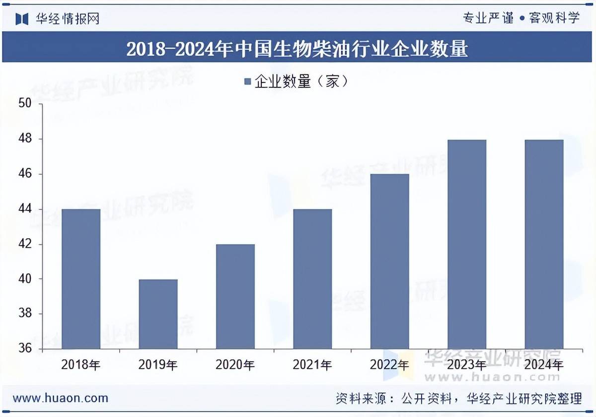我国自“十五”期间起头成长生物柴油,并正在多地推广试点工做,但大大都地域最终并未推广起来。从我国生物柴油行业企业数量来看,2024年我国生物柴油行业企业数量为48家,取2023年持平。